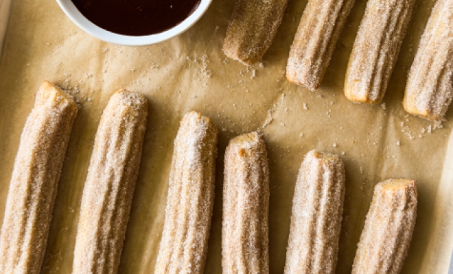 In a small baking dish, pour in 1 cup of boiling water. Carefully add the baking dish to the very bottom of the oven, then add the churros on the upper racks.