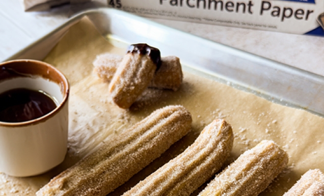 In a small baking dish, pour in 1 cup of boiling water. Carefully add the baking dish to the very bottom of the oven, then add the churros on the upper racks.