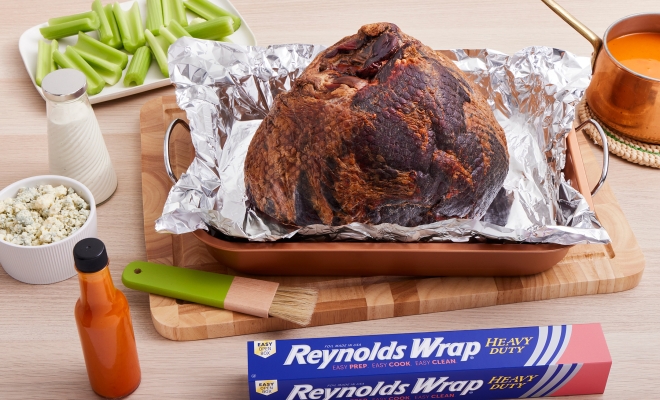 BRUSH ham with buffalo sauce every 15 minutes during the last hour of baking. Remove from oven and discard foil. Let ham rest for 10 minutes.