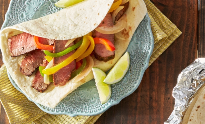 WRAP tortillas in foil add to grill to heat while slicing steak. Serve beef, peppers and onions wrapped in warm tortillas with salsa.