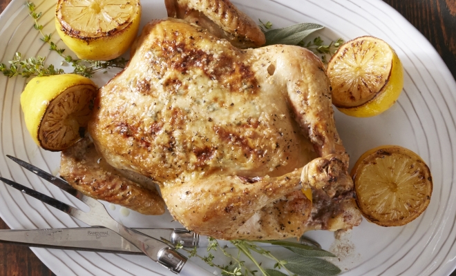 Mix butter with garlic, lemon zest and thyme. By hand, carefully loosen the skin all the way around the chicken. Spread the butter between the meat and the skin. Cut lemon in half and put in cavity of chicken. Truss the chicken.