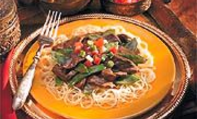 SERVE over angel hair pasta. Sprinkle each serving with tomatoes and green onions.